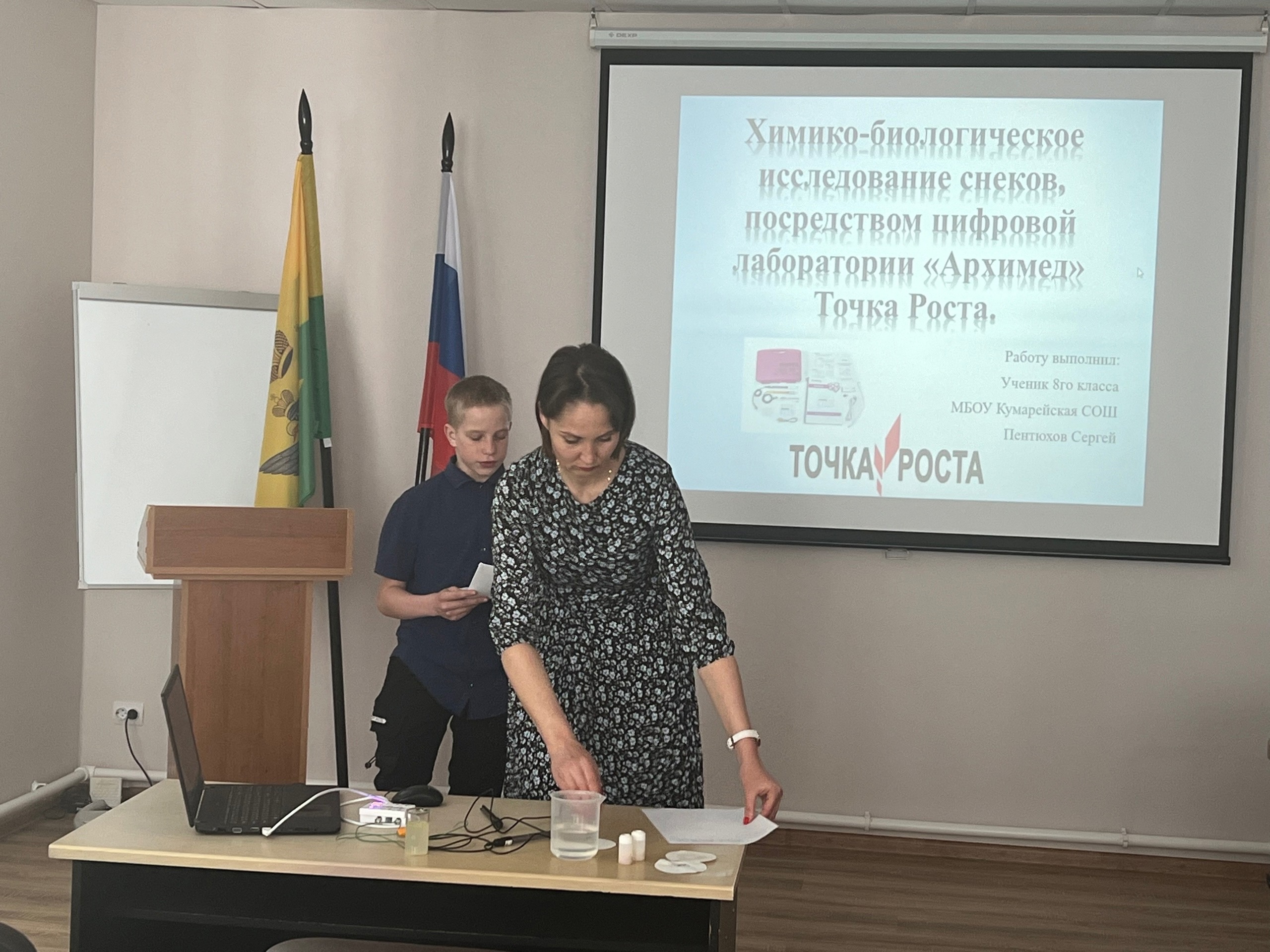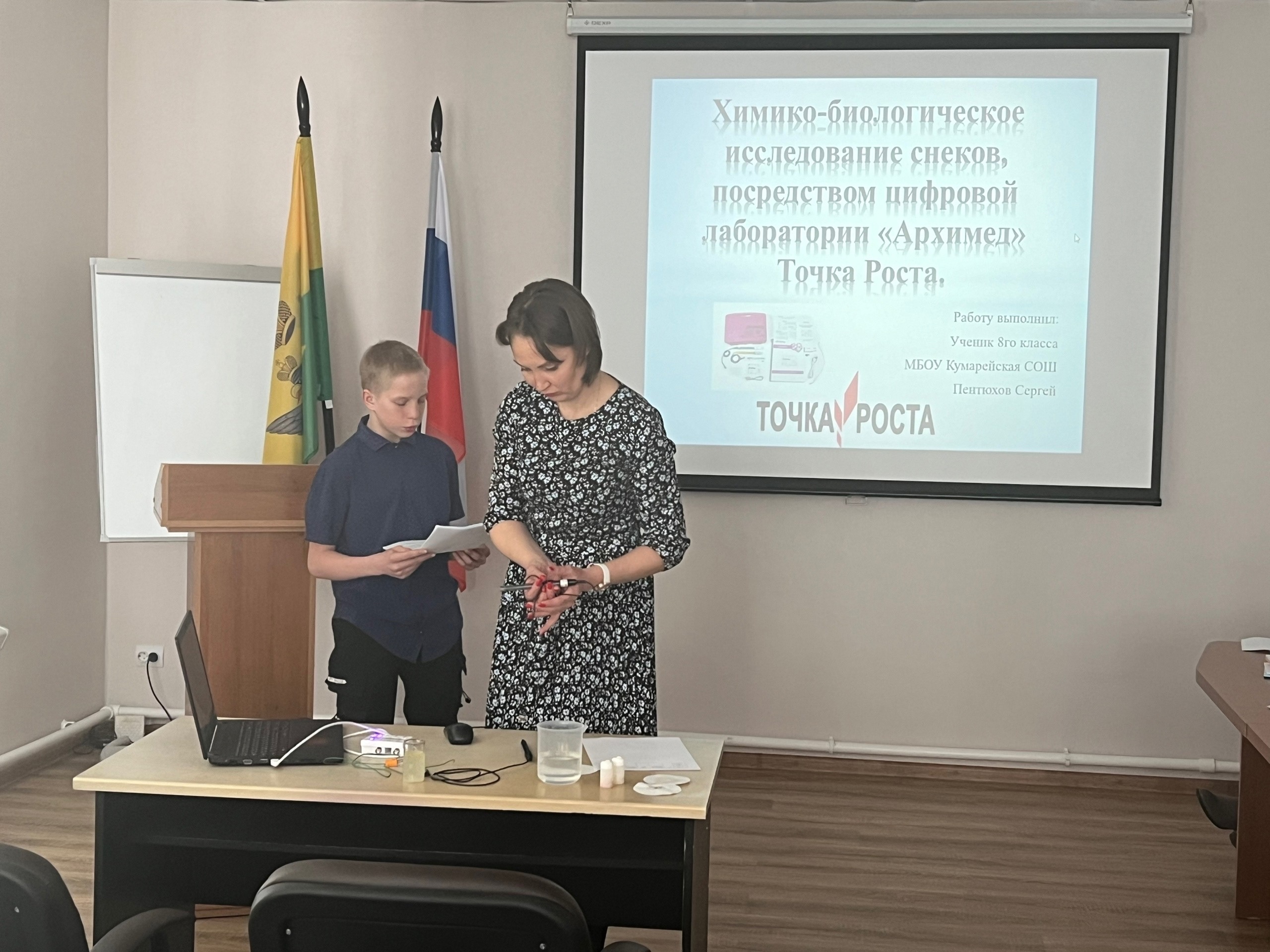 27 апреля учащийся нашей школы Пентюхов Сергей занял 1 место в районной НПК школьников "В мир поиска, в мир творчества, в мир науки" с научно-практической работой  центра "Точка роста". Под чутким руководством наставника - педагога центра "Точка роста" Орловой Н.В. Сергей представил научно-практическую работу на тему "Химико-биологическое исследование снеков посредством цифровой лаборатории "Архимед " центра "Точка роста"". Работа имела отличную практическую часть и практическую значимость. Сергей уверенно работал с оборудованием и делился результатами своих исследований. Поздравляем Сергея и Надежду Васильевну с заслуженной победой!